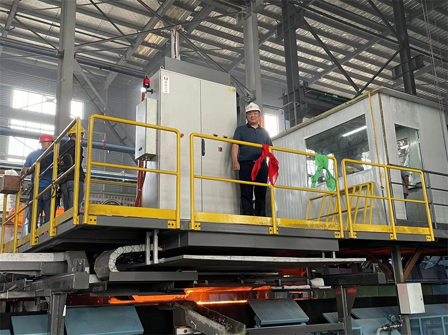 2022年9月12日上午八點(diǎn)十八分,隨著“出水”一聲令下,中頻爐第一爐鐵水緩緩傾入鐵水轉(zhuǎn)運(yùn)包中,裝有鐵水的轉(zhuǎn)運(yùn)包通過鐵水轉(zhuǎn)運(yùn)系統(tǒng)自動(dòng)運(yùn)抵迪砂線澆鑄機(jī), 鐵水通過自動(dòng)澆注機(jī)完成澆注,整體生產(chǎn)線調(diào)試順暢,運(yùn)行平穩(wěn),滿足設(shè)計(jì)要求。