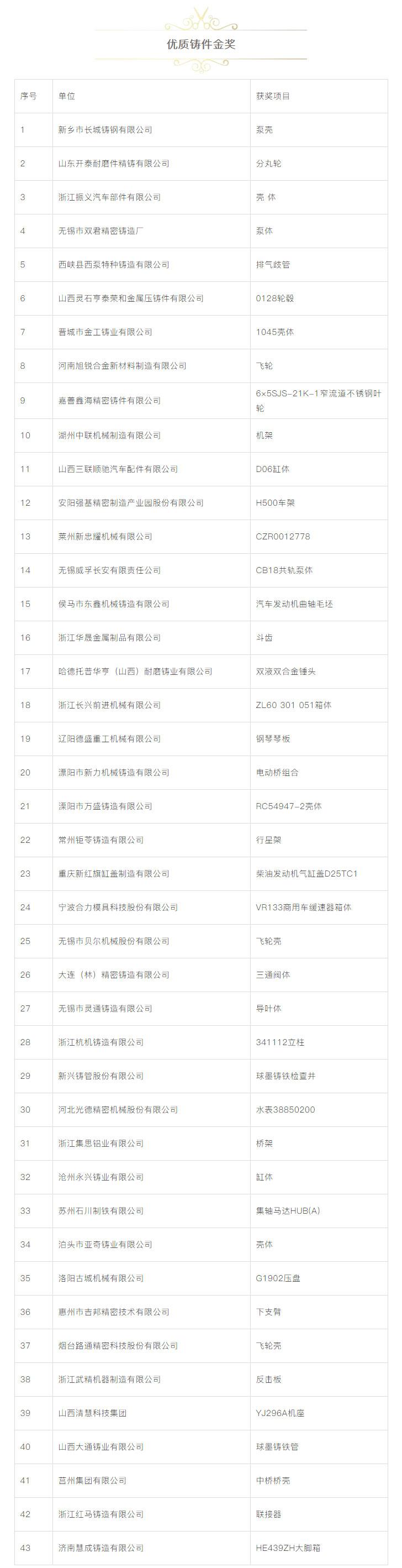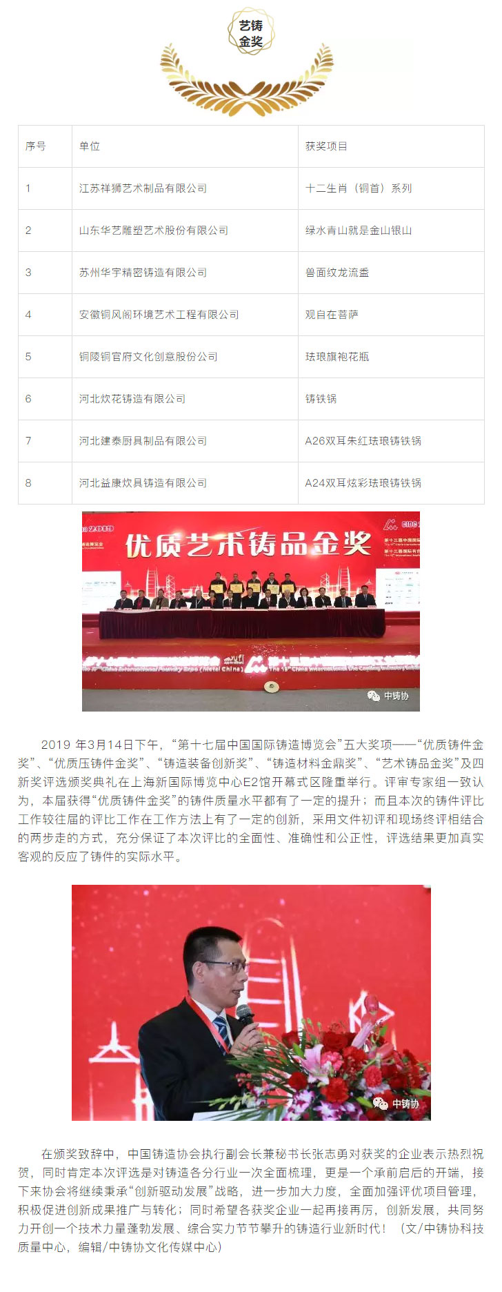 為了進(jìn)一步鼓勵(lì)鑄造行業(yè)科技創(chuàng)新,推動(dòng)鑄造行業(yè)質(zhì)量工作,更好地服務(wù)于鑄造行業(yè)轉(zhuǎn)型升級(jí),本著“評(píng)先獎(jiǎng)優(yōu)”’的原則,中國鑄造協(xié)會(huì)在“第十七屆中國國際鑄造博覽會(huì)”及“第十三屆中國國際壓鑄工業(yè)展覽會(huì)”期間,繼續(xù)對(duì)參展的鑄件、壓鑄件、鑄造裝備、鑄造材料、藝術(shù)鑄品及四新技術(shù)開展了評(píng)比活動(dòng)。本次評(píng)選活動(dòng)得到廣大參展商的大力支持,共有154家企業(yè)的200余件展品參與申報(bào)評(píng)優(yōu)。